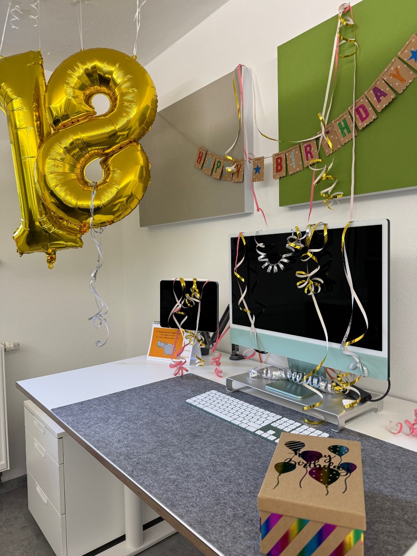 Natürlich durfte da ein festlich geschmückter Arbeitsplatz nicht fehlen – mit Ballons, Luftschlangen und ganz viel guter Laune. 🎈✨